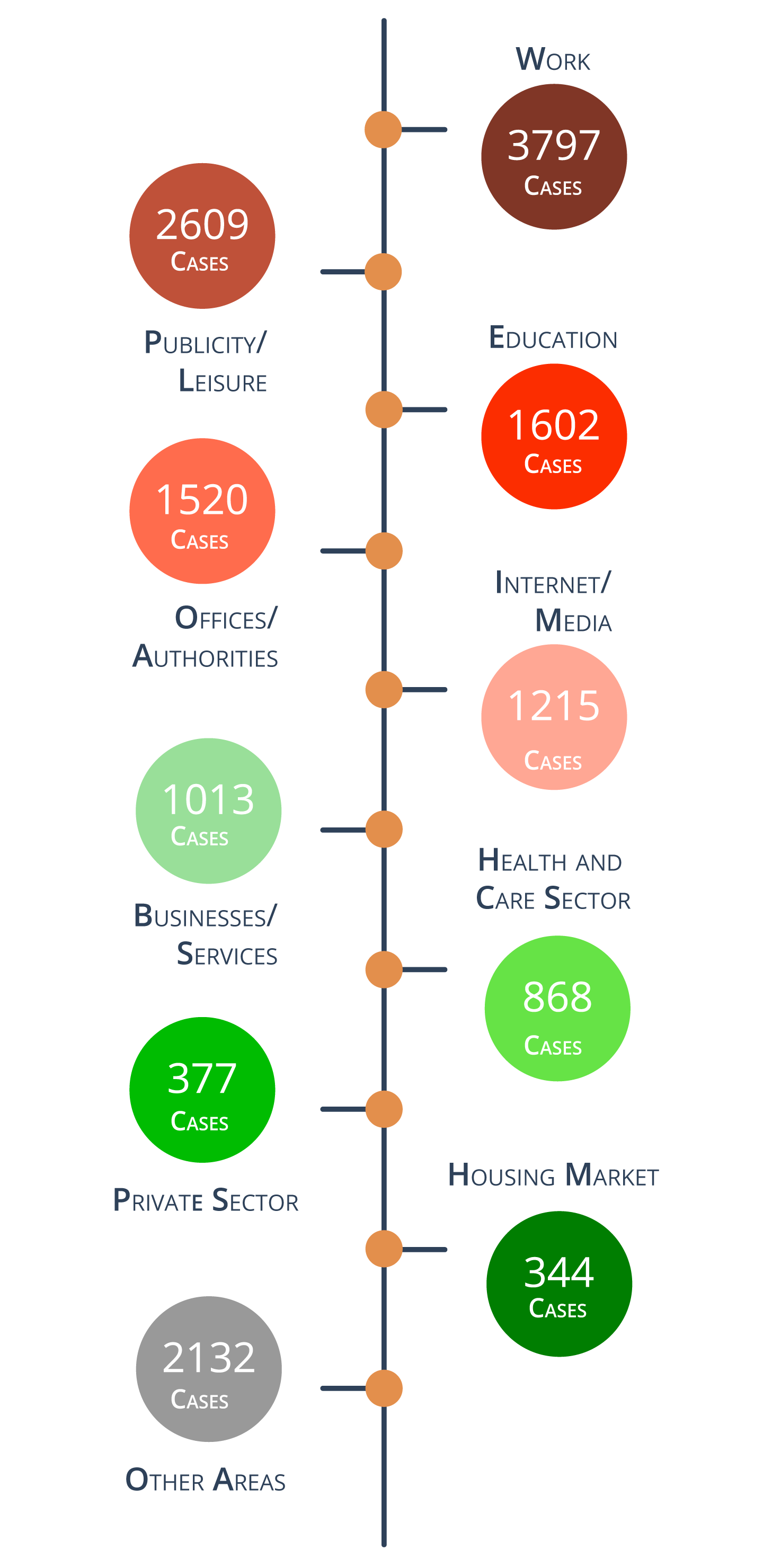 Individuals frequently face discrimination when entering employment or in the workplace itself. However other areas of life are also affected. Click on the bubbles and discover which other areas were mentioned in the study above. The numbers in the circles reveal the amount of cases reported.